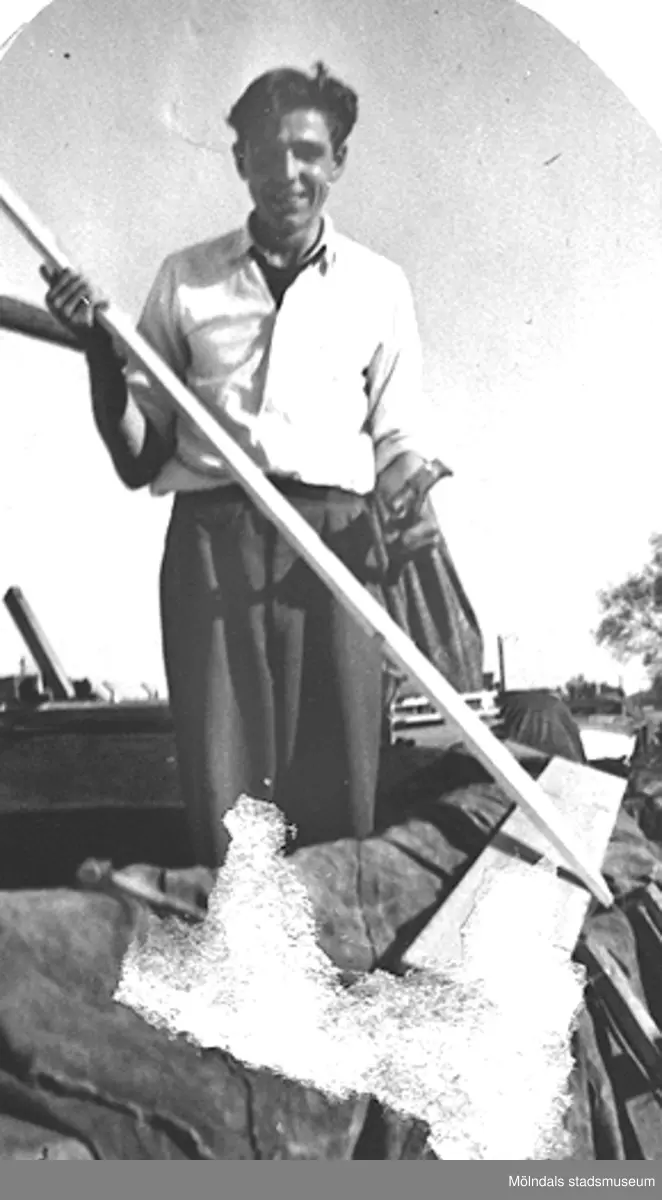 En man står i en båt på Fattighusån (mellan Stampgatan och Ullevigatan i Göteborg), 1950-tal. Givaren Roland Segerstam var med i Mölndals Motorbåtsklubb i många år under 1950 - 60-talen. De hade ett litet båtvarv och hamn intill lilla bron (i närheten av Mölndals sjukhus) vid Mölndalsån.