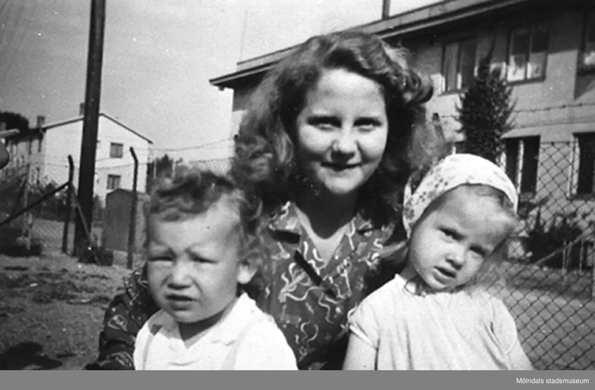 Håkan Carlsson, praktikant Margit Emilsson (gift Wannerberg -52) och en flicka på Krokslätts daghem under Margits praktik som biträde: 1945-10-01 - 1946-08-01.
