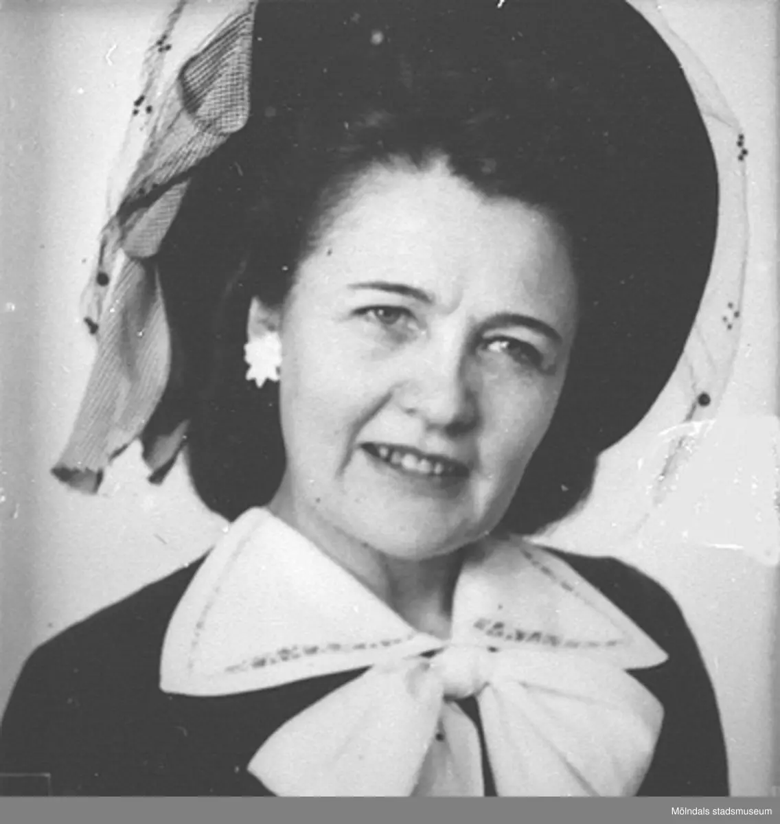 Del av fotokarta med 20 stycken porträttbilder av Karin Hasselberg (1903 - 1996) med och utan hatt. Karin började arbeta på Stretereds skolhem 1924 och slutade på 1960-talet. Hon hade en tjänstebostad på Stretered. Från 1940-tal till 1960-tal hade hon sitt hem på Skolgatan i Haga, parallellt med bostaden på Stretered.