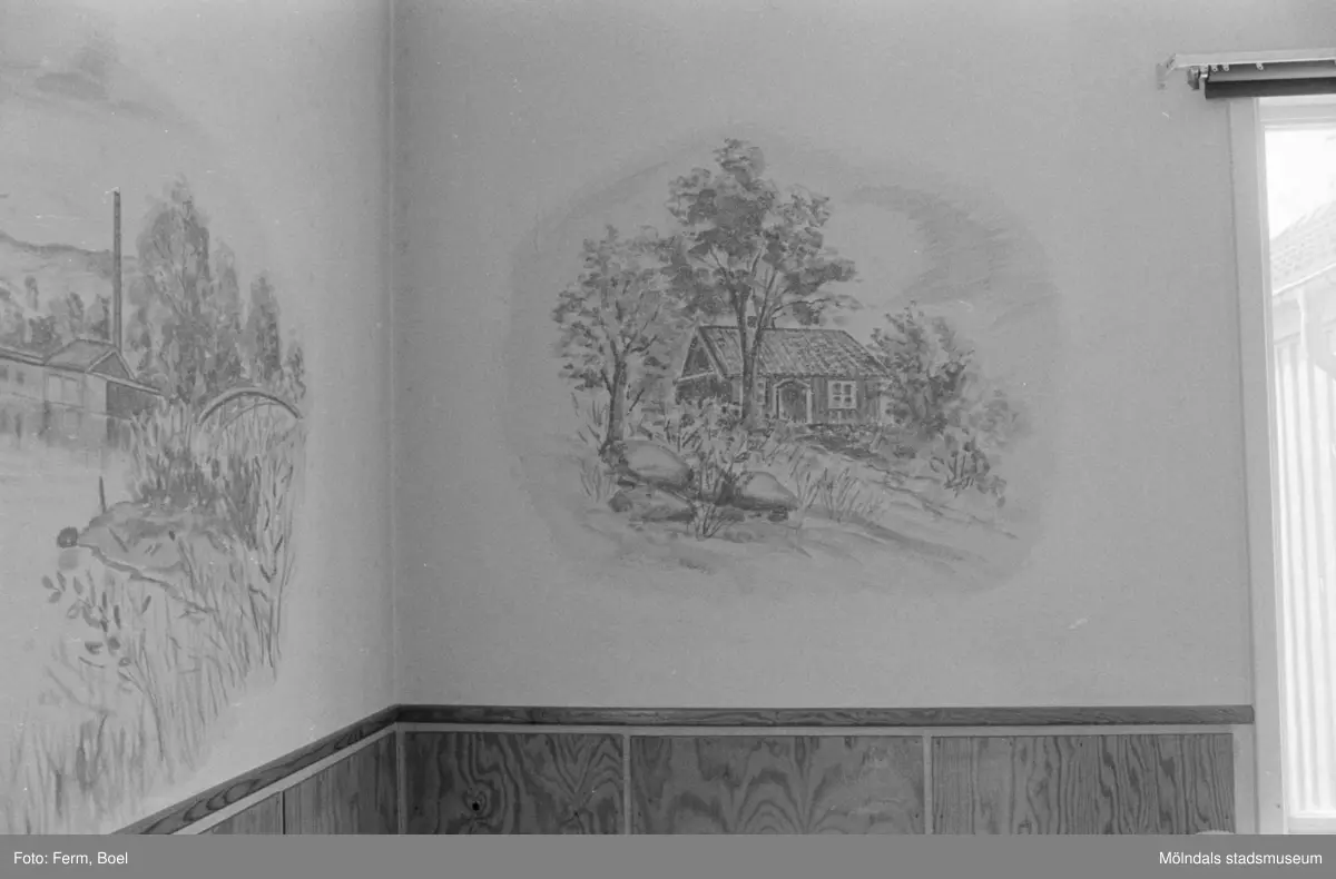 Dokumentation av väggmålningar i Ryets bibliotek 1992. Biblioteket har tömts på grund av nedläggning. Till vänster ser man en del av Grevedämmet 31 samt Sågdalens bro och till höger ser man Fåfänga på Nybyggaregatan 3-5.