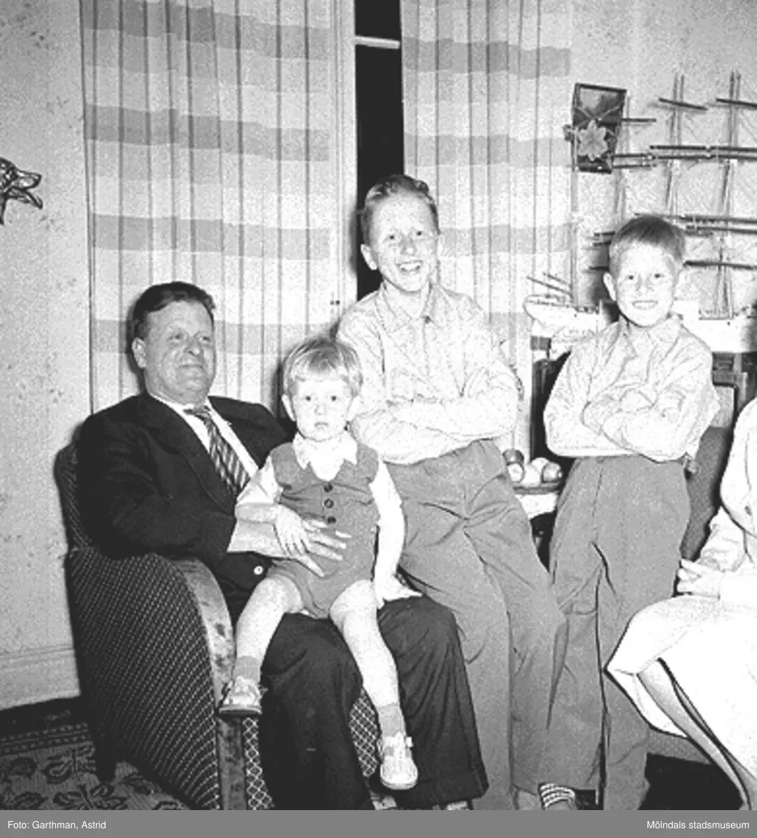 Hemma hos familjen Garthman. Från vänster; pappa Helmer med Jerry i knät, Leif-Åke, Alf och mamma Astrid. Familjen bodde på Barnhemsgatan 21, 1 rum och kök med kammare, år 1958.