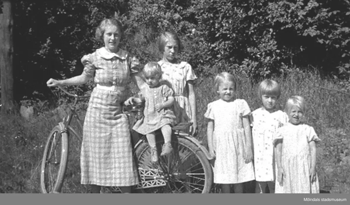 Barnen i familjen Karlsson står vid en cykel på Kvarnfallet 31, år 1936. Från vänster: Astrid (gift Garthman), Rolf (på cykeln), Margit (gift Larsson), Birgit och Ingrid. Något utav barnen är okänt. Skänkt av sonen Alf Garthman som arbetade under många år på Mölndals stadsmuseum.