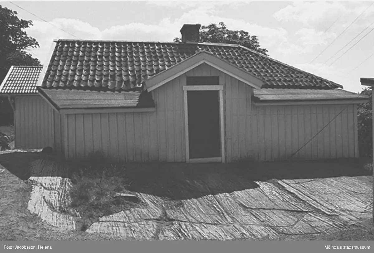 Titel: Exteriör av bostadshus med bergstomt på Roten M 29 i Mölndals Kvarnby, 1972.