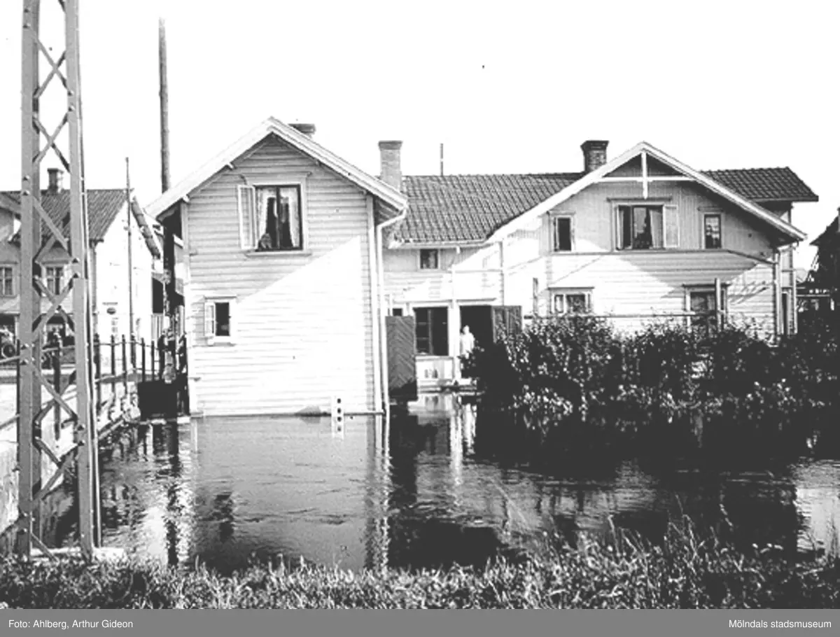 Översvämning i Mölndalsbro omkring 1920. Göteborg-Bohus läns sparbanks hus, på Kungsbackavägen 1, sett bakifrån.