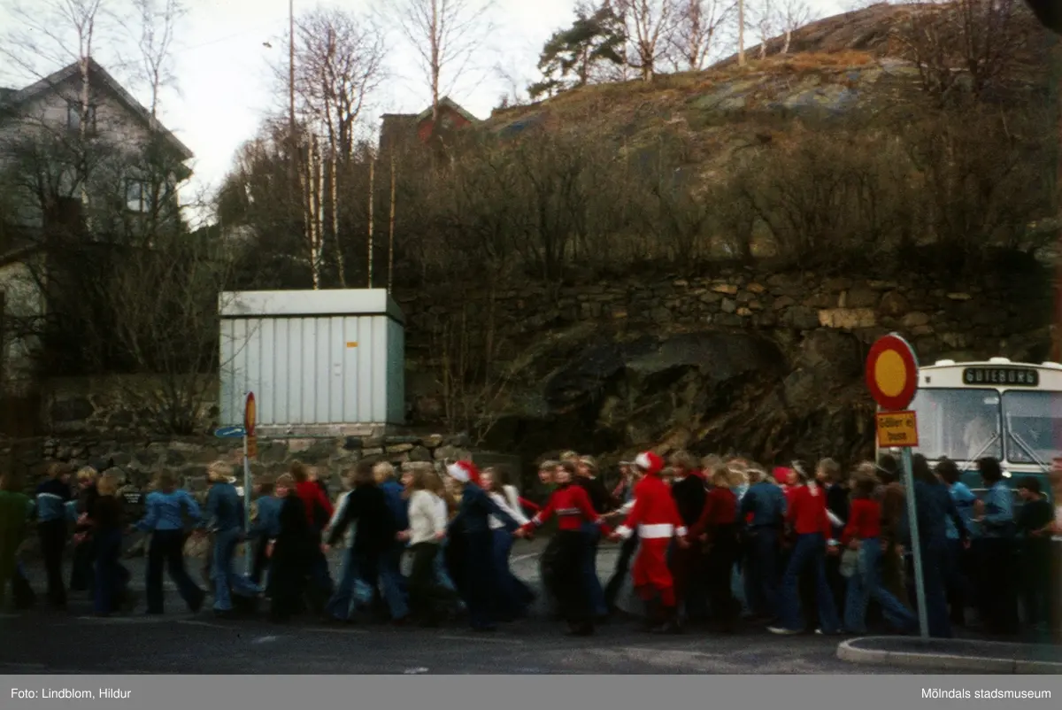 En samling ungdomar tågar förbi en busshållplats vid Gamla Torget i Mölndal, 1970-tal. Några av ungdomarna verkar ha glitter i håret och någon bär en tomtedräkt.