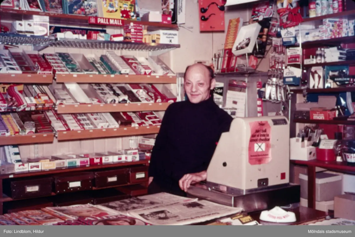 En man står vid kassan i tobaksaffären vid Gamla Torget i Mölndal med adress Kvarnbygatan 45, 1970-tal. Mannen hette eventuellt Lagher i efternamn. Huset används numera av Kvarnby bageri.