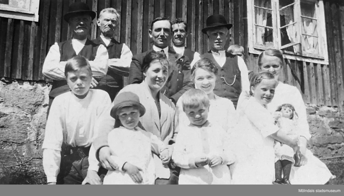 Anna Emilsson, Sonja Persson med dockan Margit, Ella Johansson, Nils Emilsson, Augusta Persson, Gösta, Harry, Karl Andersson, Martin Andersson, Johan Persson, Emil Emilsson och Albert Persson på söndagsträff eller kalas, 1930-talet.