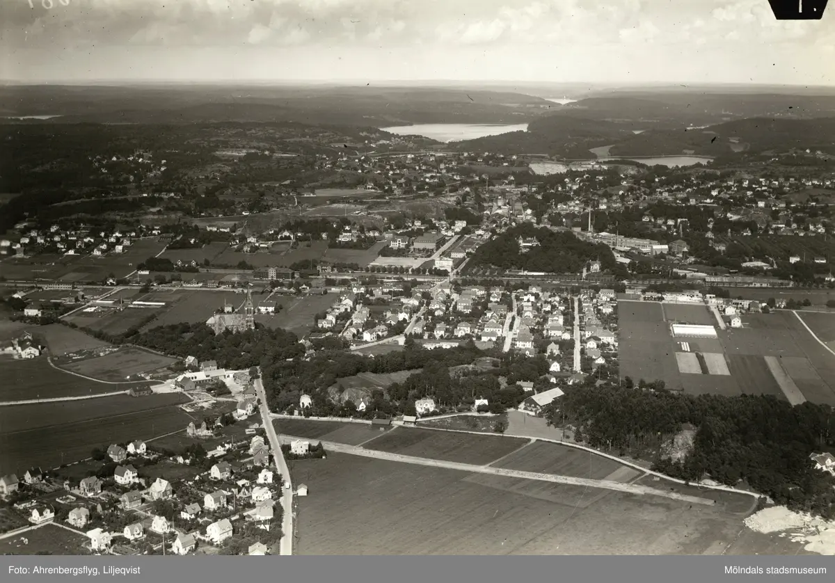 Flygfoto över Solängen, Fässbergs kyrka, Mölndalsbrområdet och Östra Mölndal, 28 april 1942. I höger bildkant, ungefär i mitten, syns Yngeredsfors trädgård. I bakgrunden skymtar Stensjön och Rådasjön.