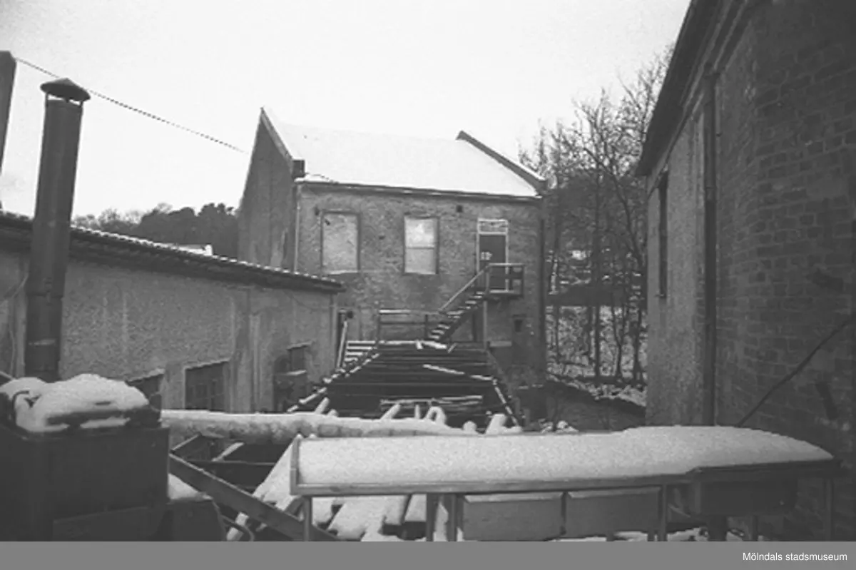 Kvarnfallet 31 i Grevedämmet, hösten 1994. Den södra fasaden av Turbinhallen, G-5. Man kan här se hur tät bebyggelsen inom fabriksområdet är. Till höger syns del av spinneriets östra fasad och till vänster syns magasinets västra fasad, främst tillbyggnaden mot norr. I mitten löper ekrännan.