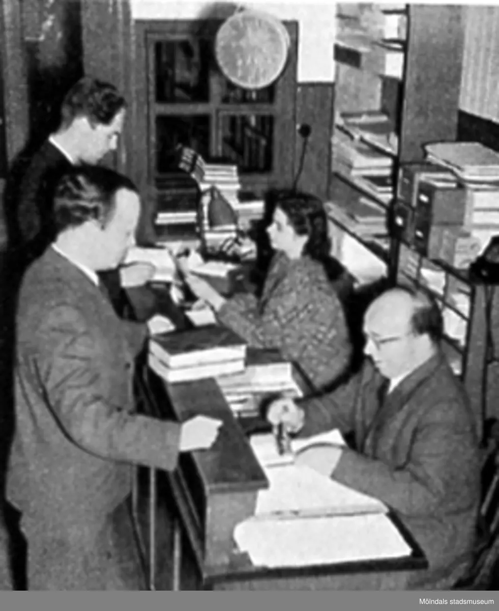 Stadsbibliotekarie Edvin Trettondal (glasögonprydd, sittandes till höger) i gamla biblioteket på Kvarnbygatan 49 (idag: Samuel Norbergsgatan 2), okänt årtal. Avfotograferad ur "Mölndal 1922 - 1947".