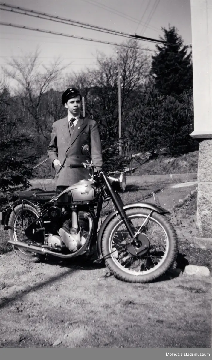 Agda och Carl-Henrik Carlsons son Lennart med första motorcykeln vid huset Rådavägen 10 i Sjövalla, Mölndal, ca 1945.