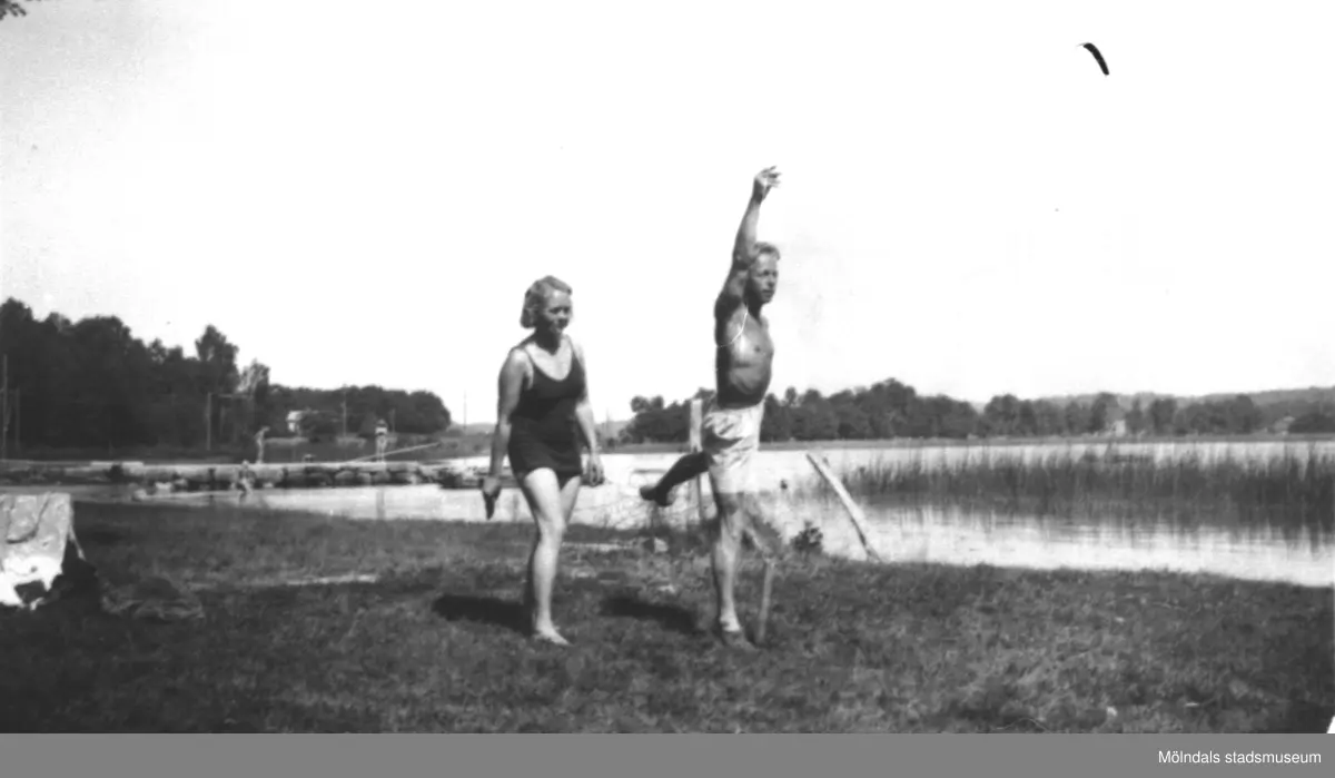 Rosa Pettersson (född Krantz) och kusinen Arnulf Thorvaldsen (från Tönsberg i Norge) kastar varpa, okänt årtal. De är vid Tulebosjöns badplats som användes av personal och boende på Steretered.