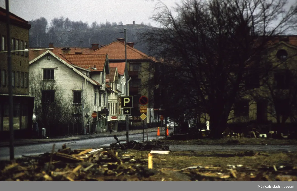 Vy österut på Frölundagatan i Mölndal, 1970-tal. På höjden i bakgrunden ses Störtfjället.