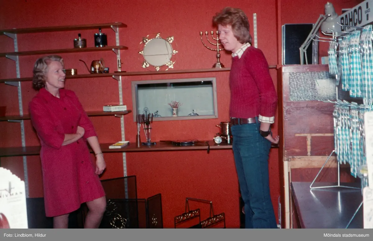 En kvinna och en man i vad som eventuellt skulle kunna vara en järnaffär. Möjligen vid eller i närheten av Gamla Torget i Mölndal, 1970-tal.