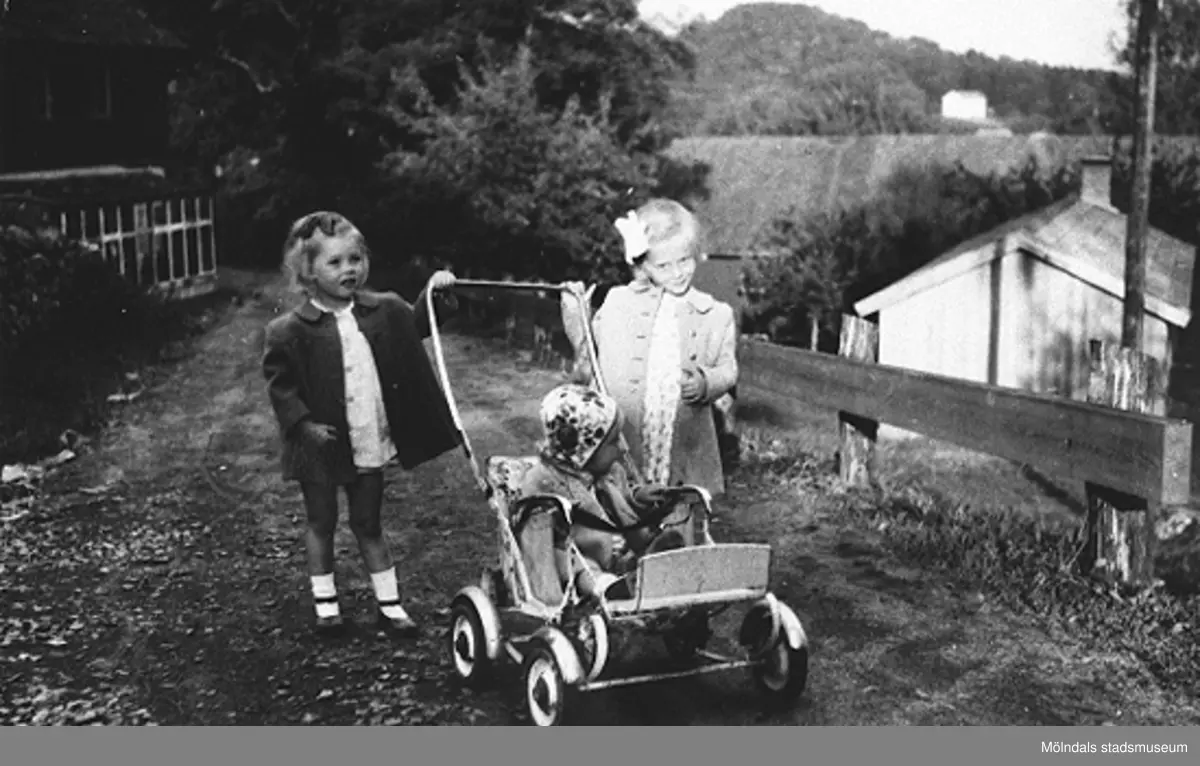 Tre vänner på promenad vid Torrekulla gård, midsommar 1948. Karin Pettersson (gift Hansson) sitter i kärran, storasyster Eva Pettersson (gift Kempe) står till höger och vännen Gerd, som är på besök, står till vänster.