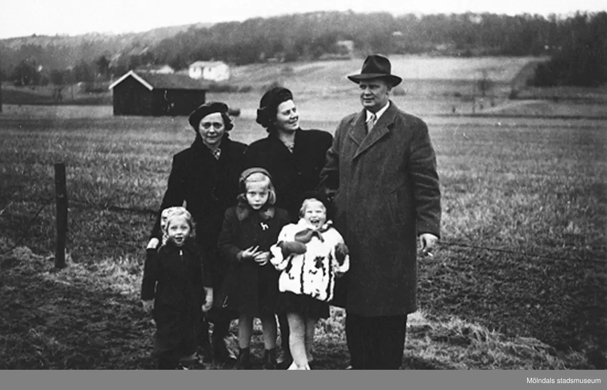 Mamma Rosa Pettersson, systrarna Karin (gift Hansson) och Eva Pettersson (gift Kempe), Elsa, Gerd och Karl-Erik Andersson. I bakgrunden syns Gunnars lada. Längre bort ses ett av husen i Alegårdsslätt.