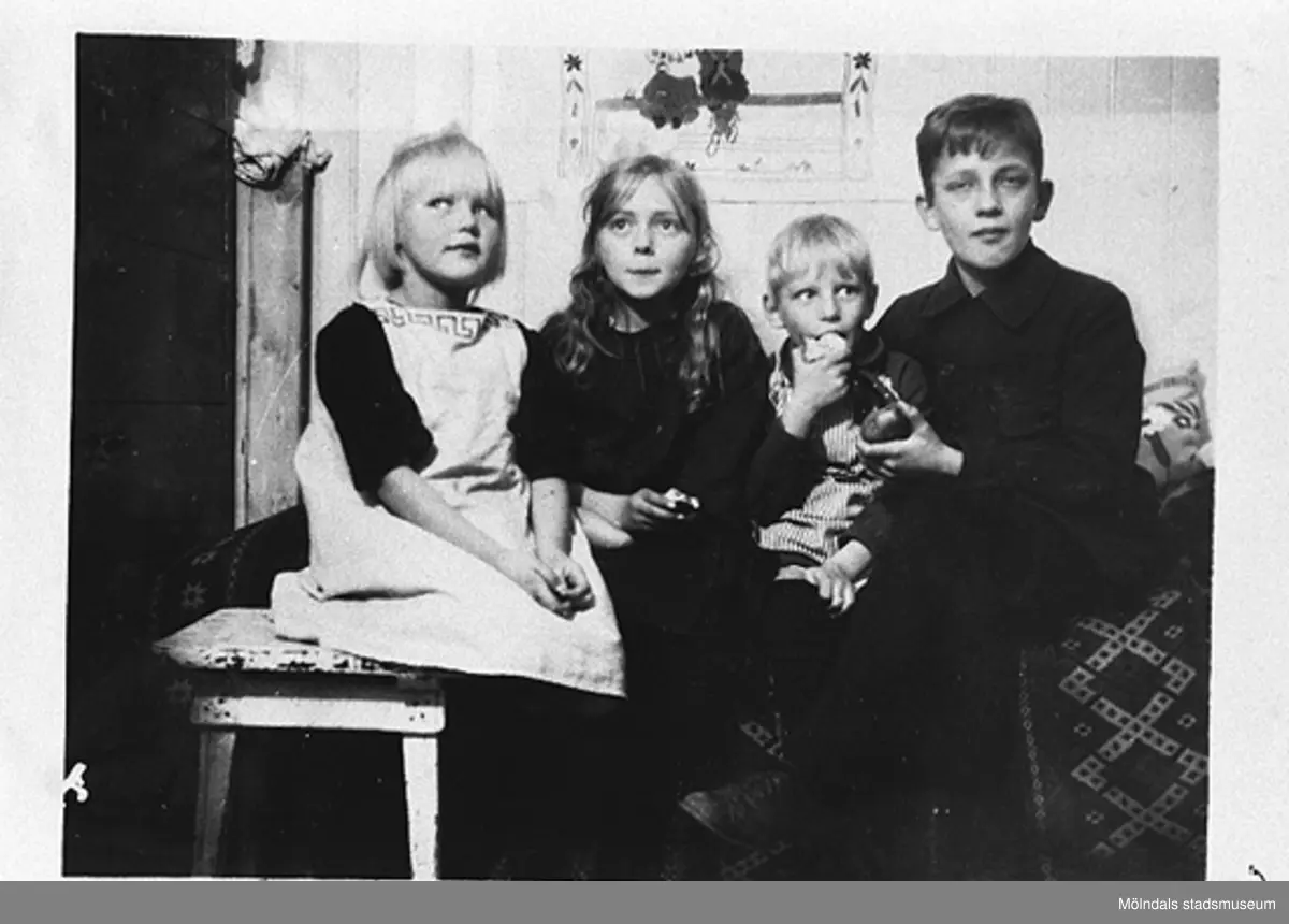 Syskonparen Östen och Rosa Krantz (gift Pettersson) samt Gertrud och Bertil Pamp, Stretered år 1923. Barnen är lekkamrater och barn till personal på Stretereds vårdhem.