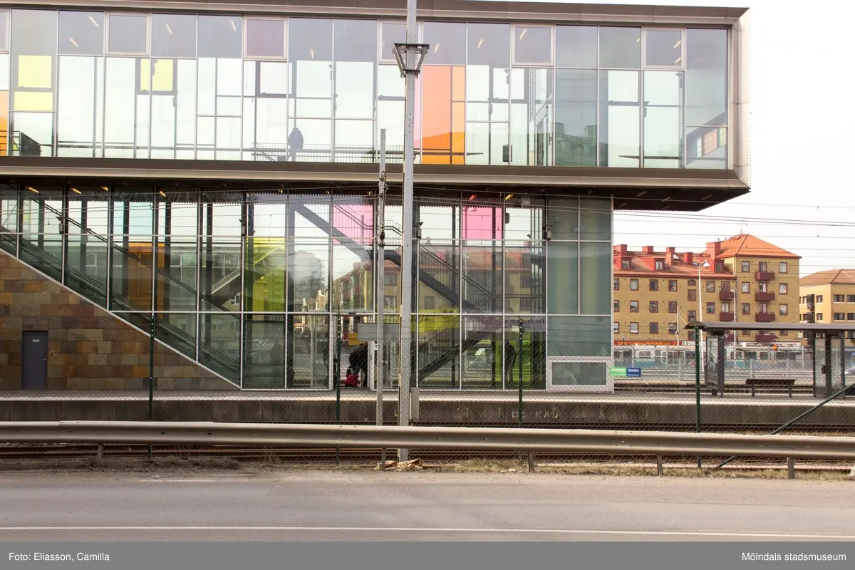 Mölndals station sedd västerut från Nämndemansgatan. Motorvägen i förgrunden är E6/E20 och järnvägsspåren är Västkustbanan där pendel och tåg stannar dagligen. Den modernt flerfärgade glasbyggnaden, designad av arkitekt Gert Wingård, är Broplatsens buss- och spårvagnshållplats samt tågstation med servicebutik, rulltrappor och hiss. Till höger ser man Mölndals centrum med den gula tegelbyggnaden Centrumhuset som ligger i början av Brogatan (tidigare Frölundagatan).