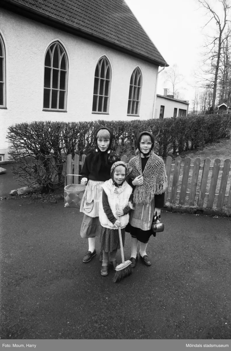 Tre flickor utklädda till påskkärringar, år 1984.