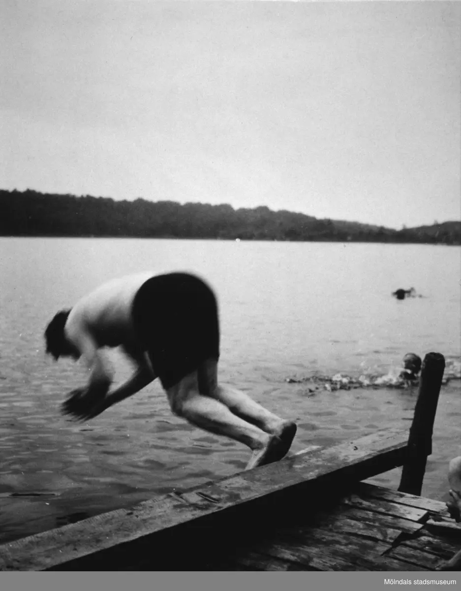 Karl Alberts (1881 - 1956) dyker från en brygga i Tulebosjön, cirka 1930.