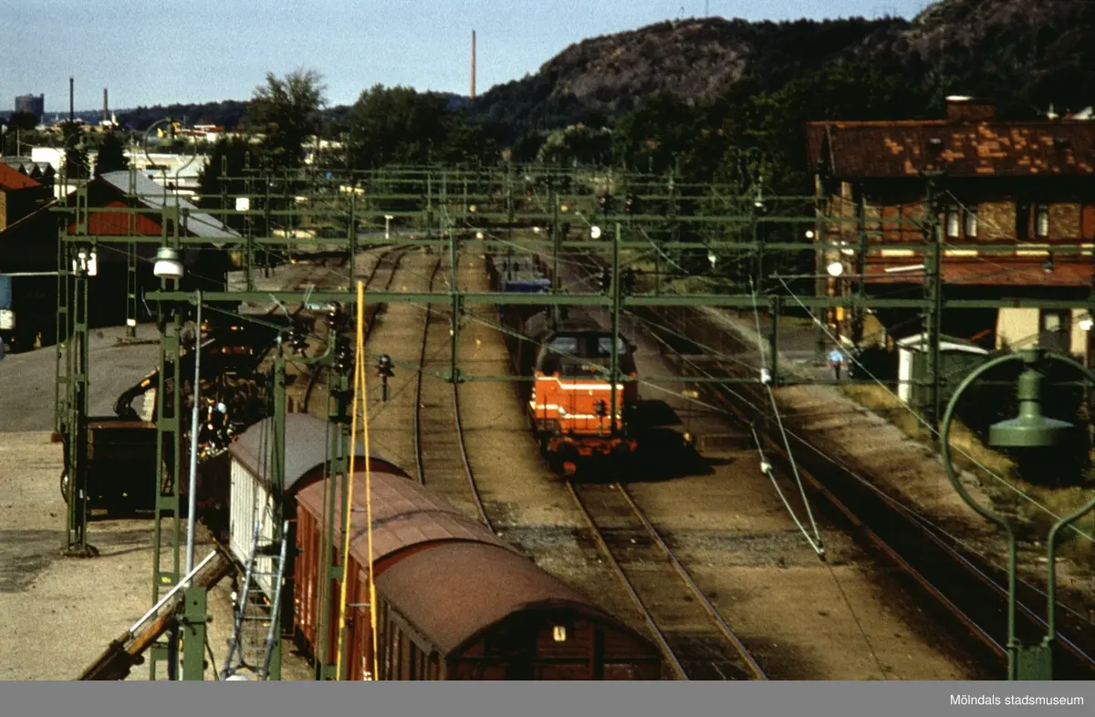 Del av järnvägsområdet i Mölndal, 1970-tal. Till höger ses järnvägsstationen Mölndals Nedre.