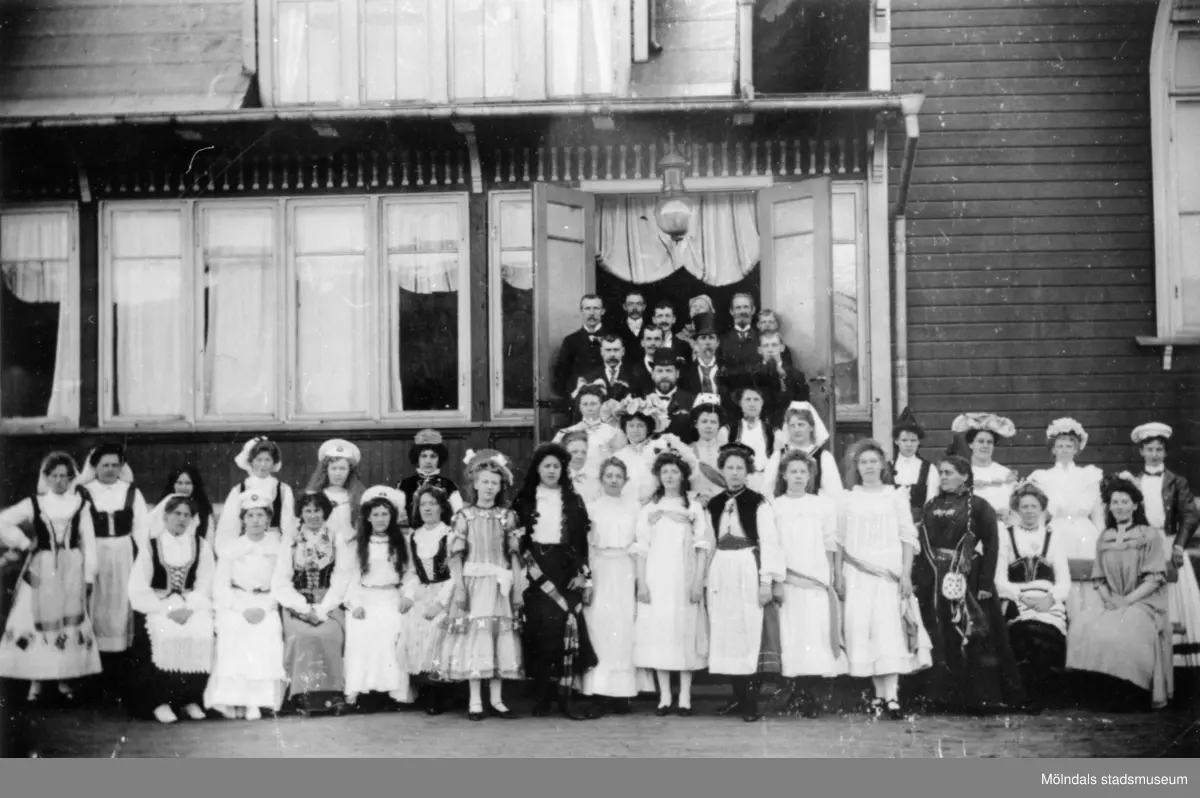 Krokslätts gamla Folkets Hus 1904. Skytteföreningen har fest och medlemmarna står utomhus, uppklädda i folkdräkt. Krokslätts gamla Folkets Hus låg på Vävaregatan (idag: Gustavsbergsgatan 8), nedanför backen som leder upp mot Krokslättsskolan. Byggnaden var bolagsägd och hade uppförts av Claes Johansson & Co Wäferi. Uppförd i slutet av 1800-talet, riven 1938.