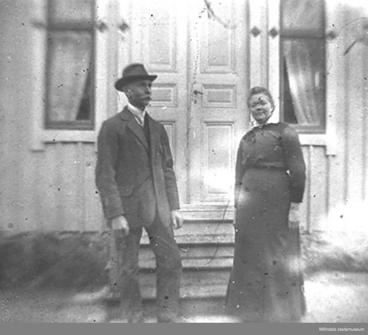 Victor Hasselberg (1864 - 1945) och hustrun Clara (1863 - 1942) utanför sitt hem Fridhem i Gastorp, okänt årtal.