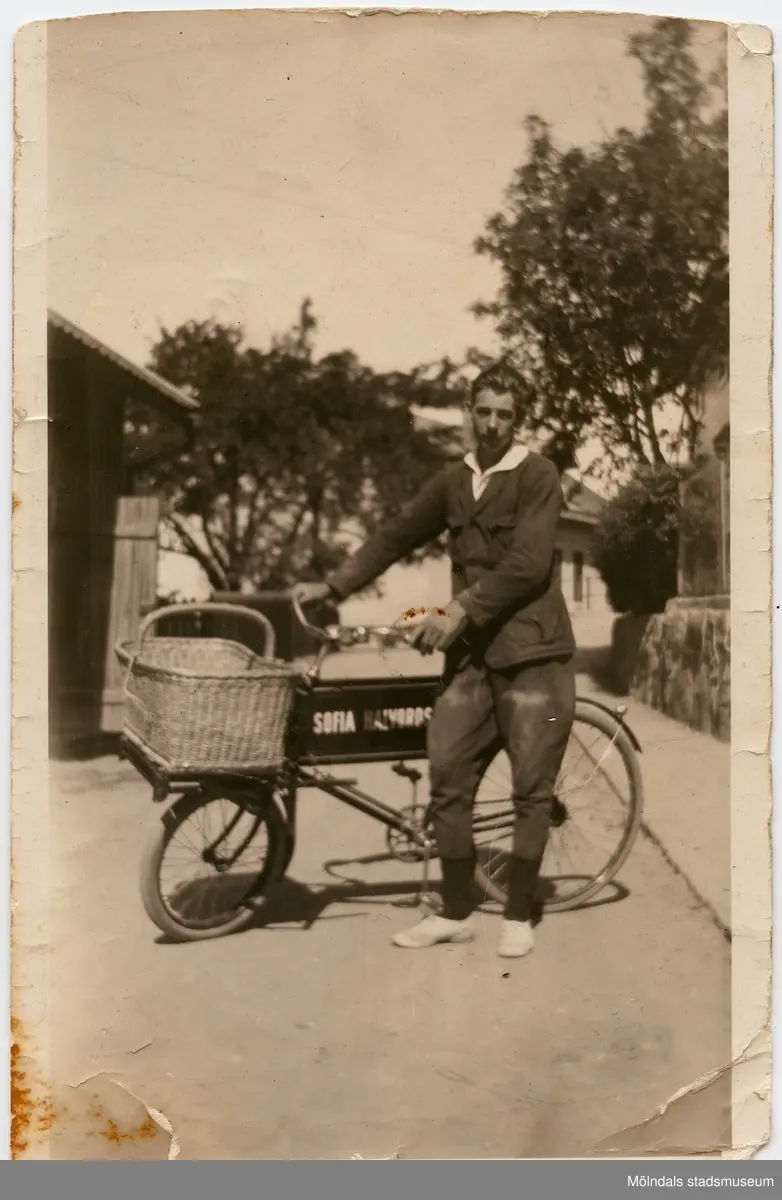 William Olsson, 1908 - 2001, med sin cykel i Mölndals Kvarnby, ca 1923-1924. William arbetade som springpojke för Asklunds bageri och för Sofia ”Soffi” Halvordsons bageri. Soffis bageri låg på Friareliden (nuvarande Samuel Norbergsgatan).