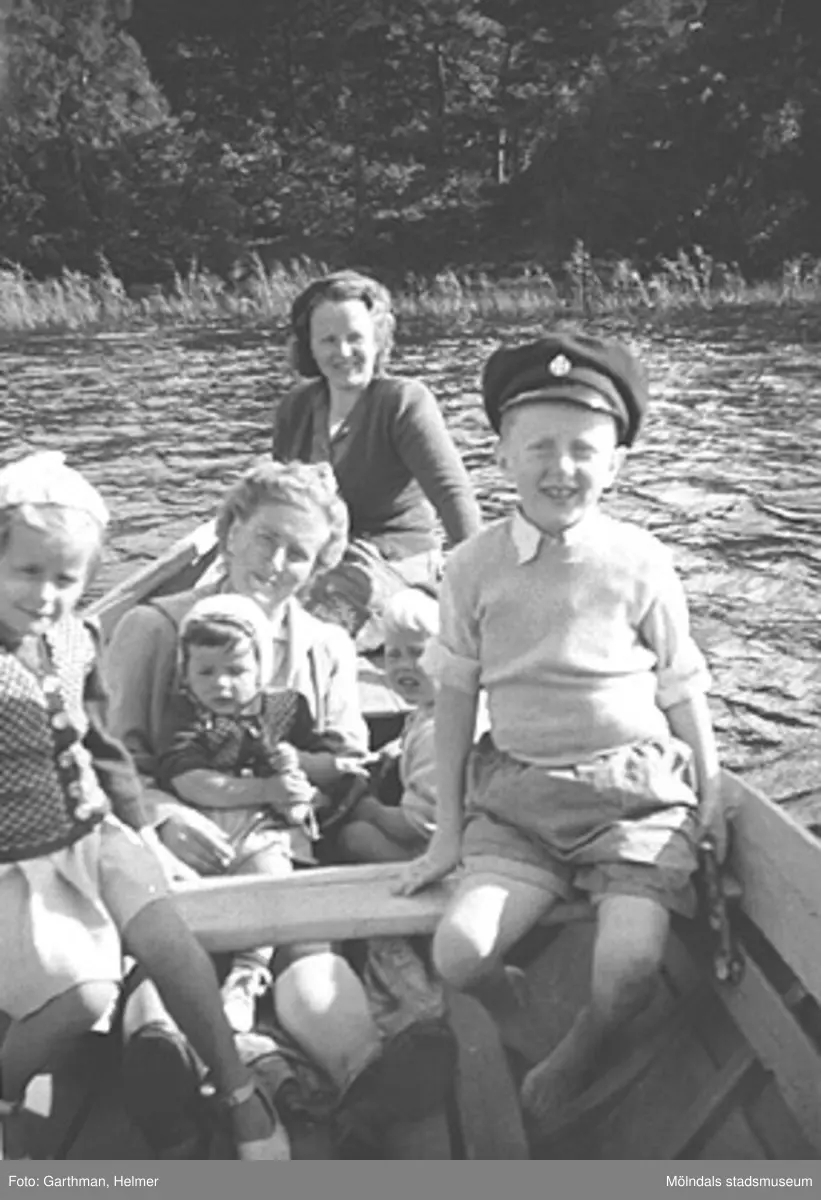 Familjerna Lopez och Garthman i en båt. Stensjön, 1950-tal. Främre rad från vänster: Angela Lopez och Leif Garthman. I mitten: Astrid Garthman med Robert Lopez i knät, Alf Garthman och Gurlie Lopez.