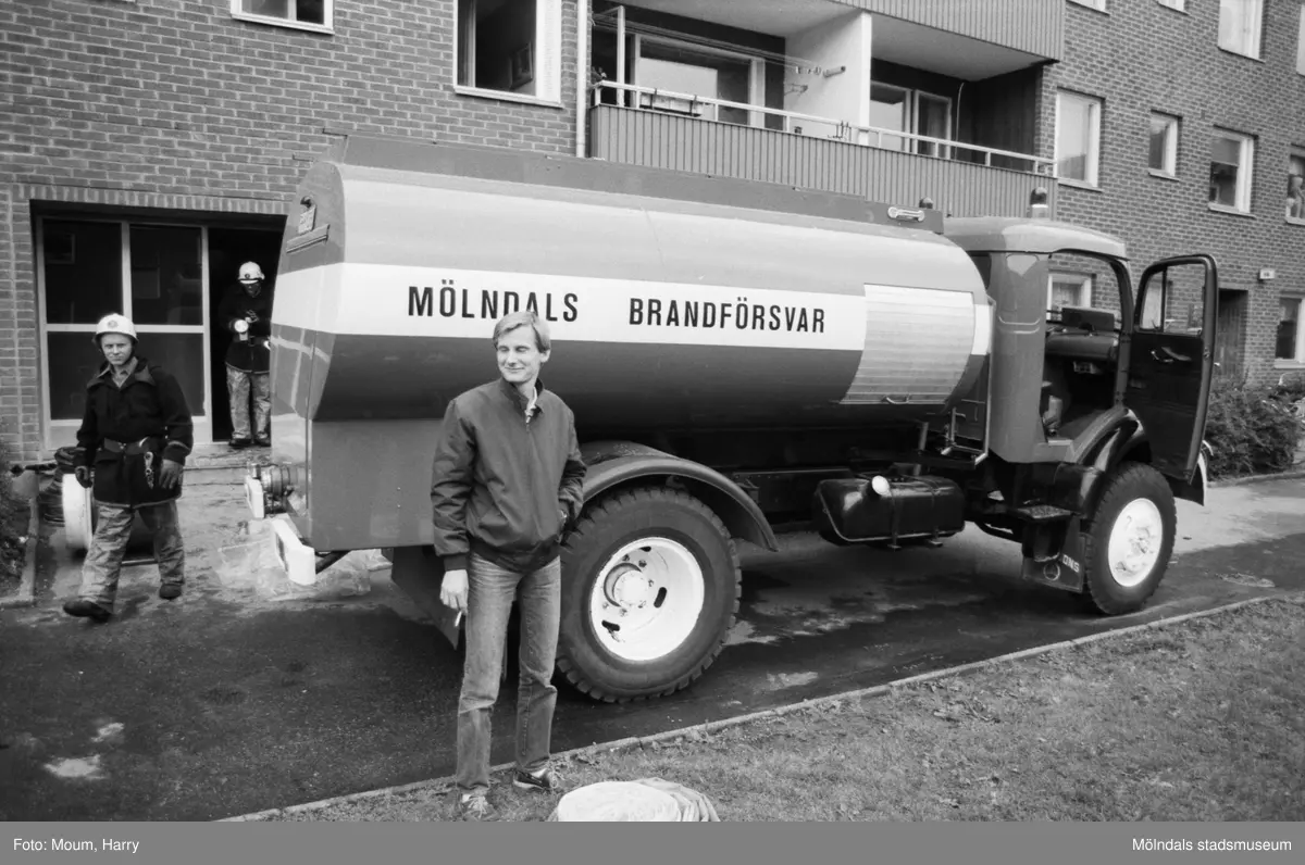 Eldsvåda på Våmmedalsvägen i Kållered, år 1983. Brandbil utanför huset.