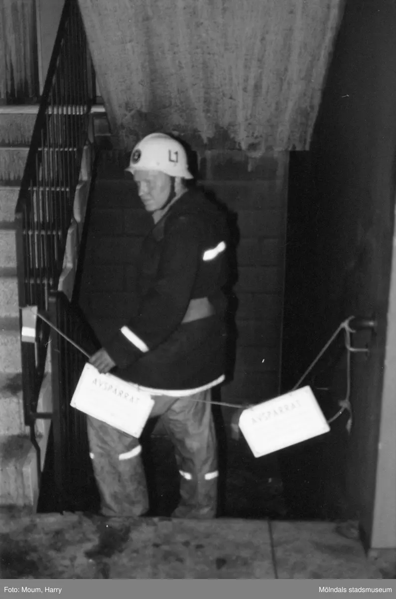 Eldsvåda på Våmmedalsvägen i Kållered, år 1983. Brandman i det eldhärjade trapphuset.