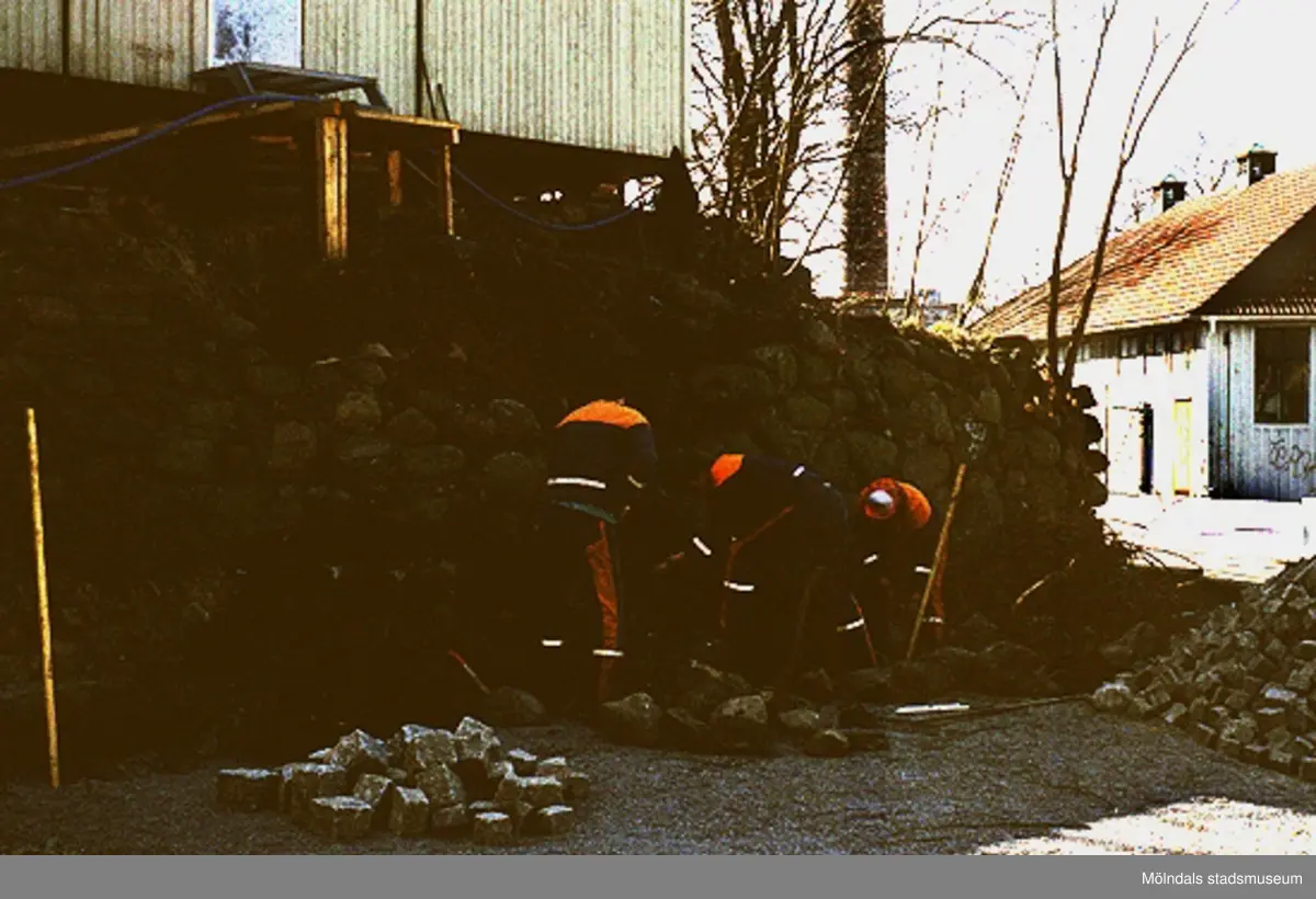 Grävarbete nedanför muren (Korndal 3) vid Lyktplatsen i Kvarnbyn, april 1993. Till höger skymtas f.d Papyrus gymnastiksal.