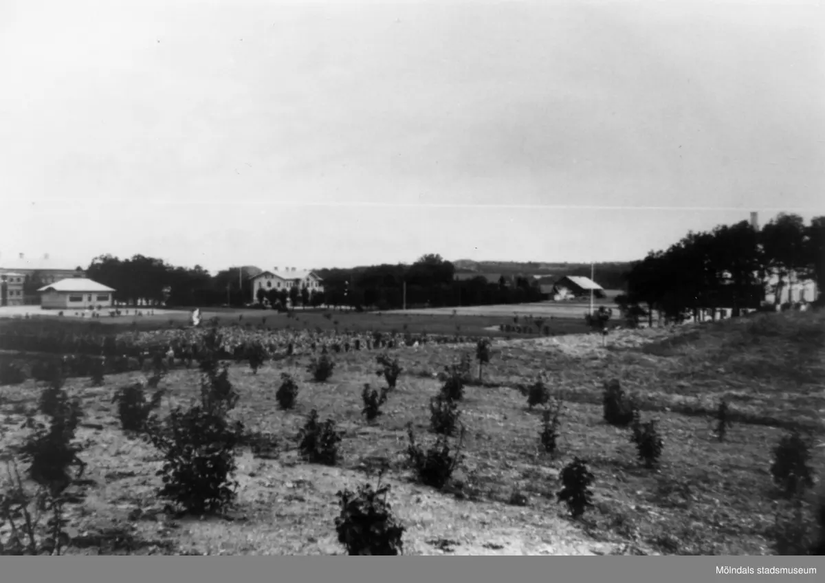 Vy över Stretered i Kållered. Elever syns bland buskarna? Förskolan är inte byggd. Det ryker från smedjan. Brattås är kalt.