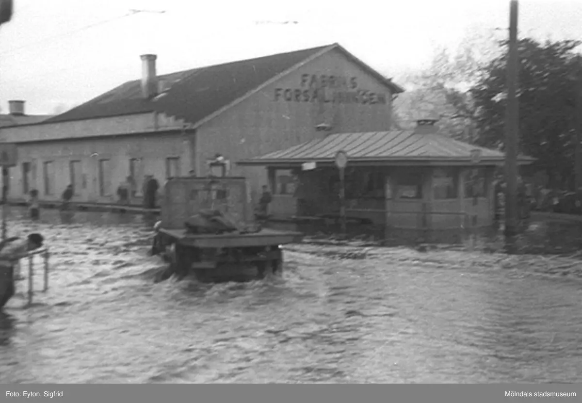 Översvämning vid Fabriksförsäljningen (f. Spårvägshallarna) och Pressbyråns kiosk vid Göteborgsvägen, 1951.