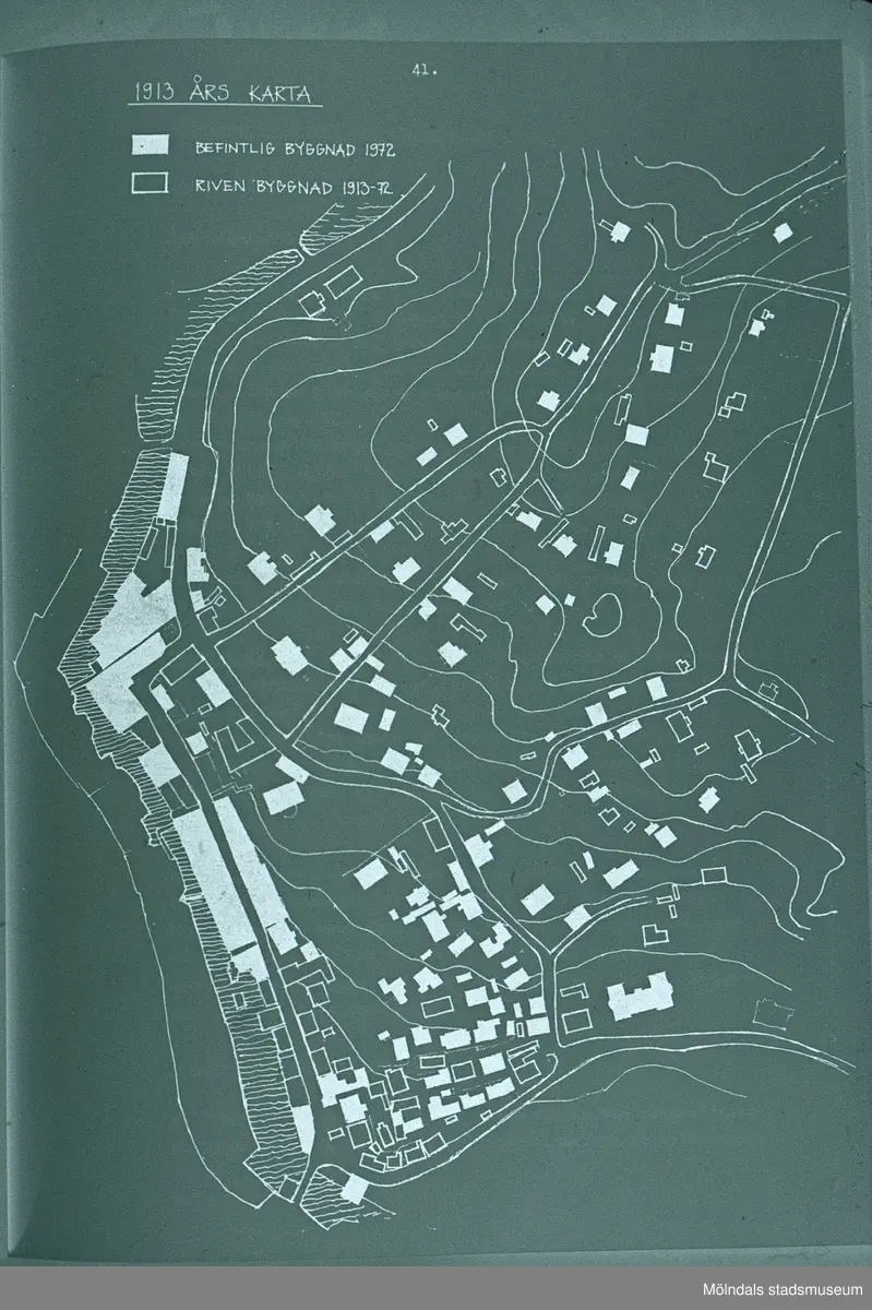 Roten K, L och M samt Götaforsliden i Mölndal. 1913 års karta som visar på befintliga byggnader 1972 samt byggnader rivna 1913-1972. Illustration i Helena Jakobssons bok om Mölndals Kvarnby från 1972.
