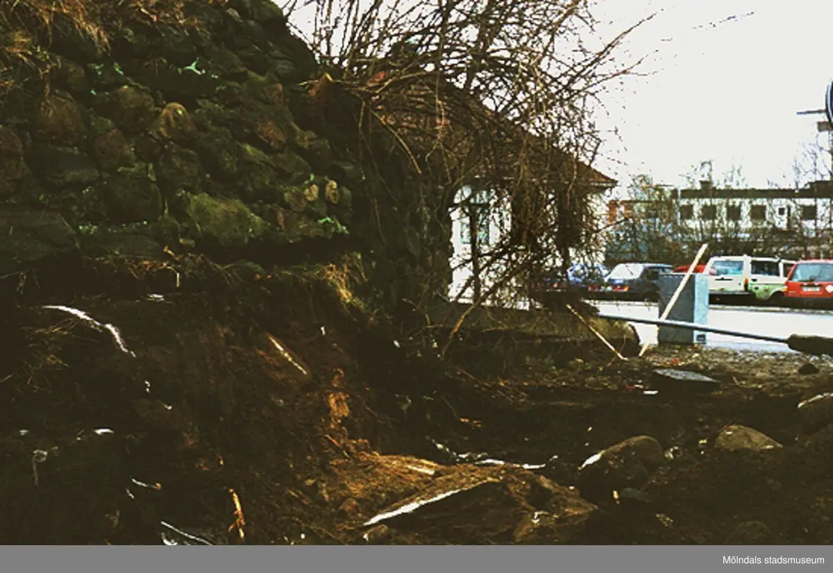 Grävarbete vid Lyktplatsen i Kvarnbyn, april 1993. Byggnaden som skymtar i bakgrundens mitt var tidigare Papyrus gymnastiksal (Byggnad 217).