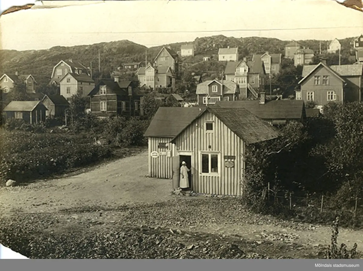 Affärsbyggnad med bostadshus bakom på Fässbergsgatan/Lyckogatan i nuvarande Toltorpsdalen, kring sekelskiftet 1900. Affärsbyggnaden är nu riven.