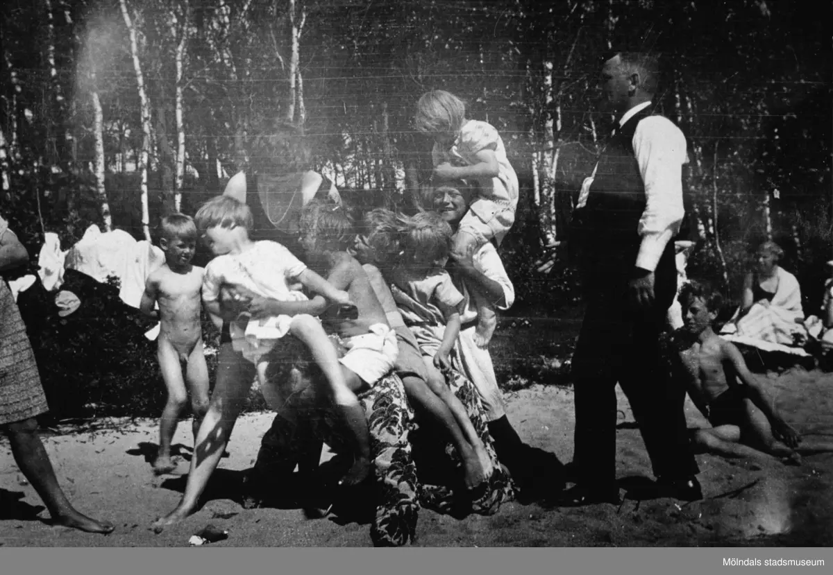 Lek och bus mellan barn vid Tulebosjön ca 1930. "Tulebos starke man" Karl Alberts (1881 - 1956) står till vänster. Bilden är något repig och ljusskadad.