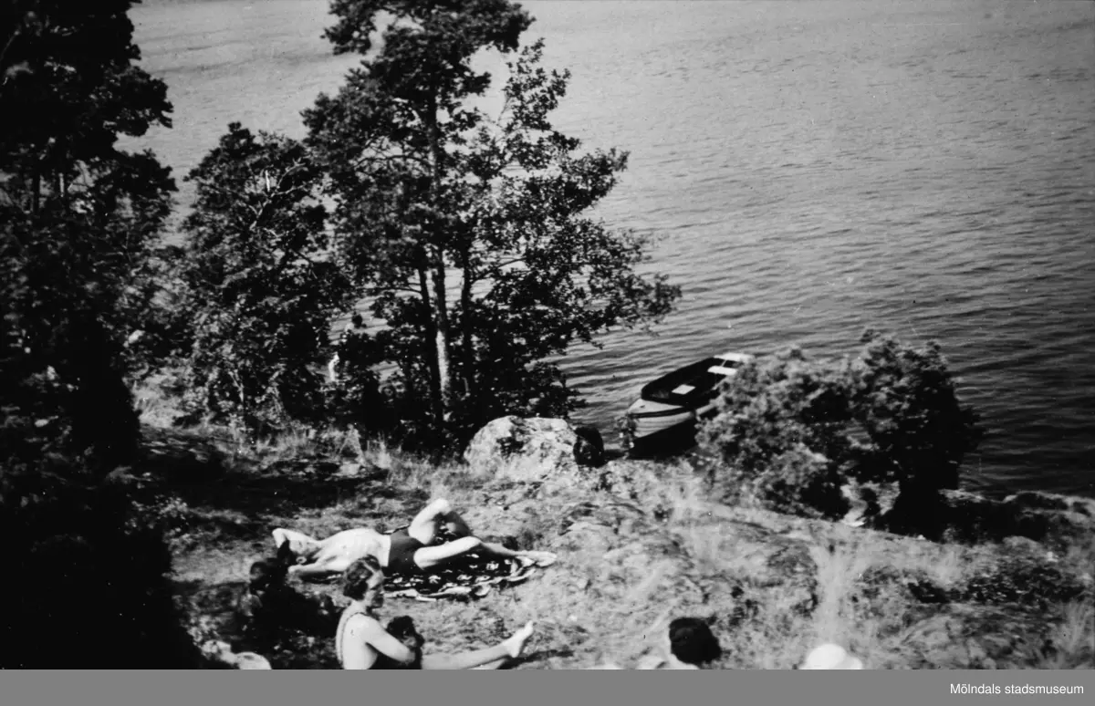 Några personer ligger och solar på en bergssluttning, troligtvis vid Tulebosjön cirka 1930. Mannen i mitten som ligger på en filt är "Tulebos starke man" Karl Alberts. I sjön ligger en fastbunden eka.