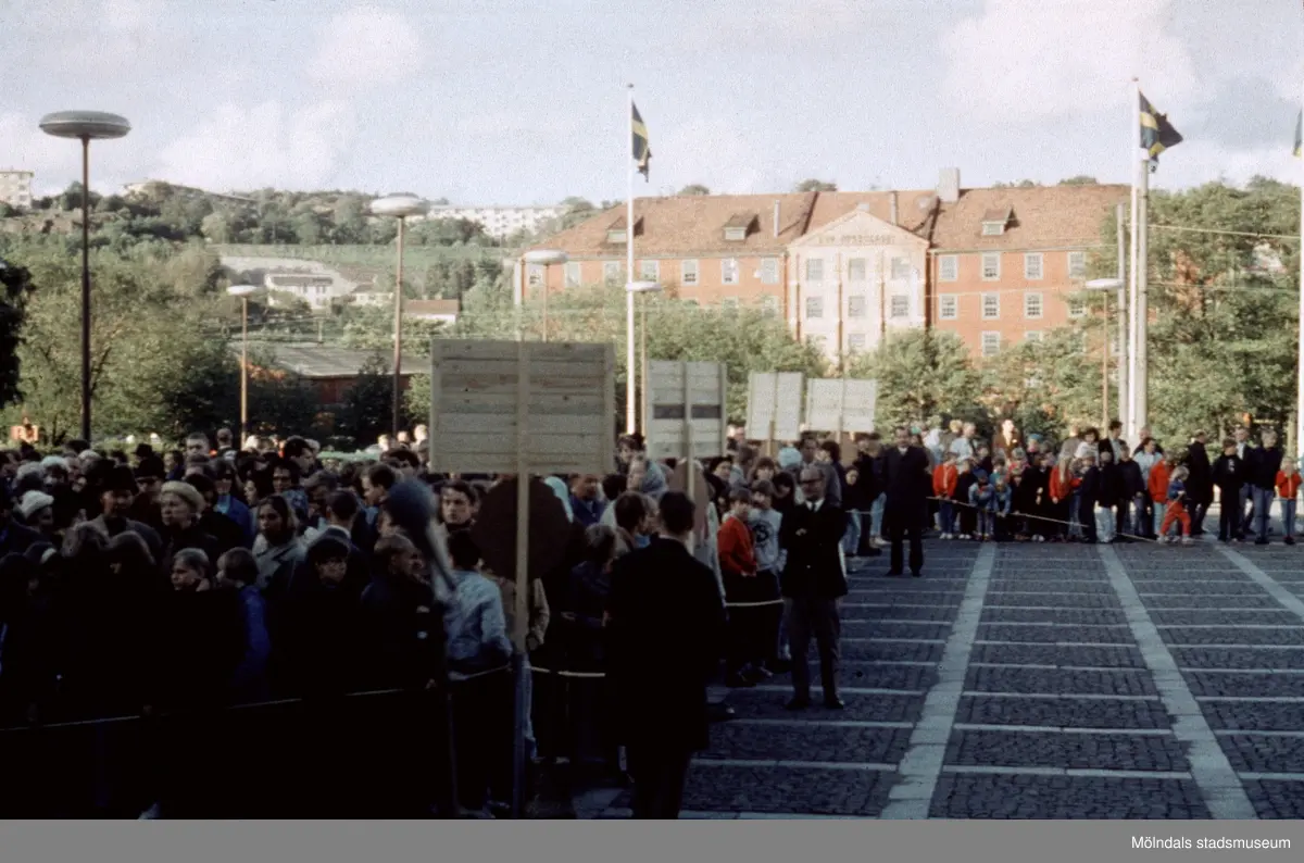 Folksamling på Stadshusplan utanför Mölndals stadshus 1960-tal. I bakgrunden ses Svalöfsbolagets (Allmänna Svenska utsädesaktiebolaget) magasin för utsäde vid Ågatan. I bakgrunden skymtar Lövgatans bostadsområde på Störtfjället.