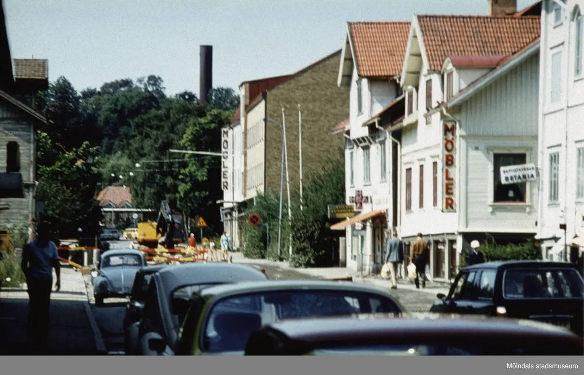 Vy västerut på Frölundagatan (idag: Brogatan) i Mölndal, 1970-tal. Längst till höger ses Baptistkyrkan Betania på Frölundagatan 4.