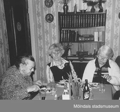 Vårfest på Brattåshemmet år 1982. Från vänster ses Augusta Andersson, anhörig Gurli Bengtsson från Vommedal Västergård (Streteredsvägen 7) och Elin Hansson.