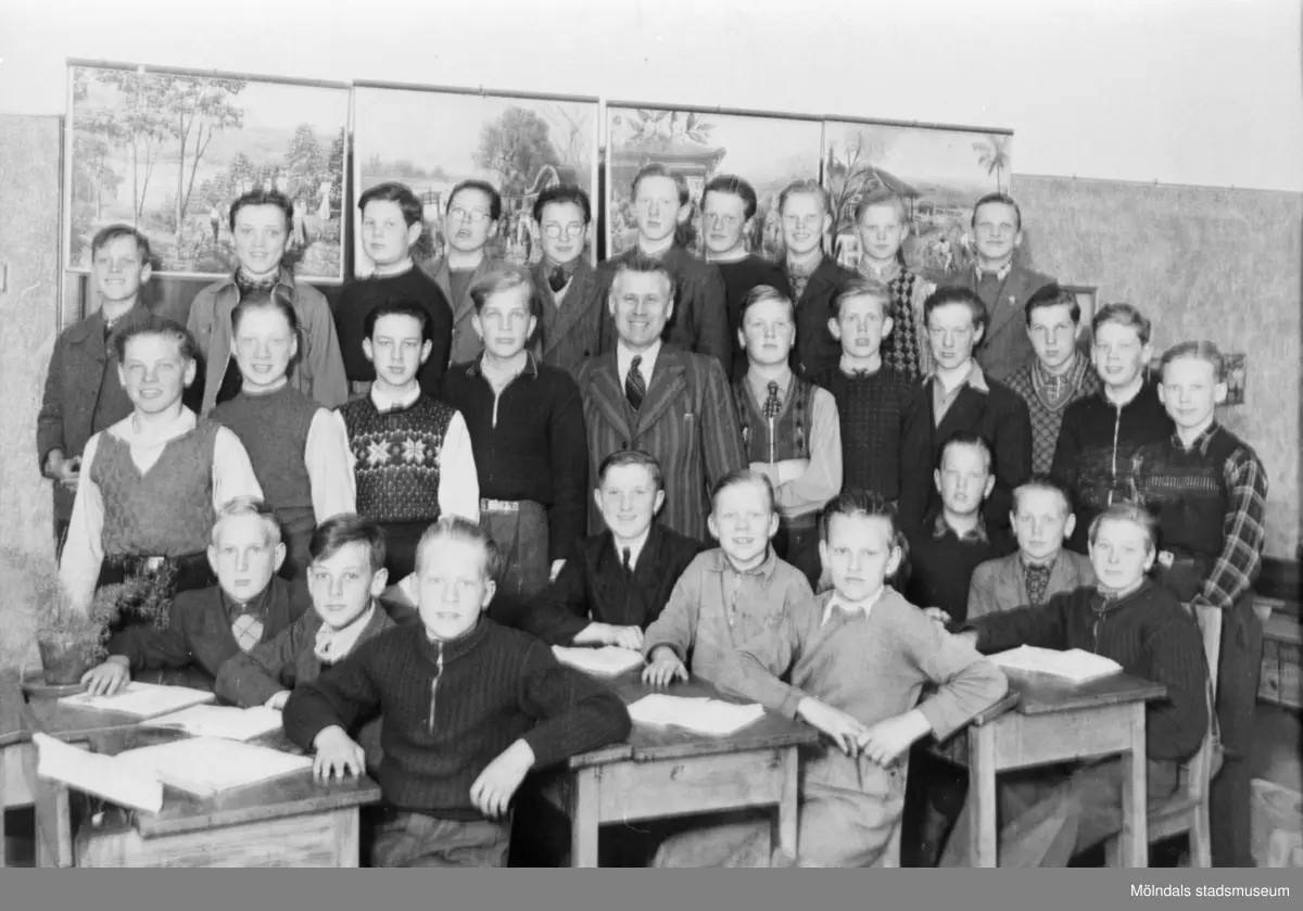 Pojkar sittandes i bänkar och stående bakom i klassrummet på Kvarnbyskolan (f.d. Centralskolan). Magister Sigfrid Eyton med elever.