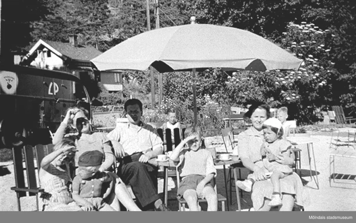 Från vänster: Angela Lopez och Alf Garthman. Bakom från vänster: Astrid Garthman, Helmer Garthman, Leif Garthman (pojken i stol) samt Gurlie Lopez med sonen Robert i knät. (Apels) Stensjö servering, 1950-tal.