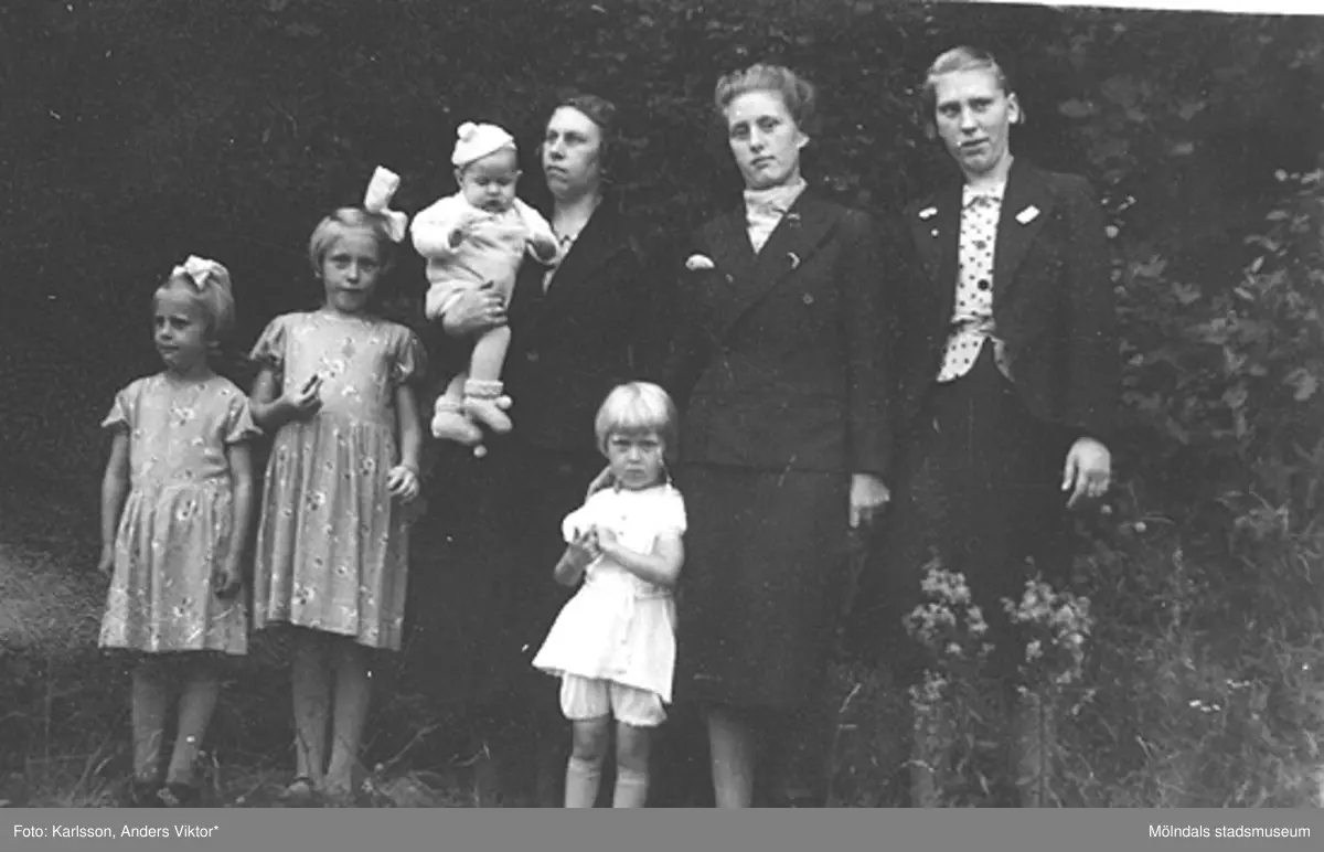 Mor Alma med alla barnen vid Kvarnfallet 31, 1930-tal. Från vänster; Margit Karlsson, Astrid Karlsson, mor Alma Karlsson, Rolf Karlsson, Kerstin Karlsson, Birgit Karlsson, längst fram Ingrid Karlsson. Alla dessa är syskon.