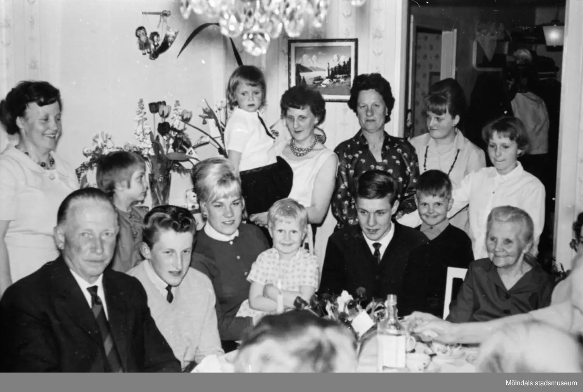 Studentfest för Lennart Svensson i hemmet i Lindome, 1960. Med på bild: Idor Malmqvist, Solveig Svensson, Sonja Svensson, Marianne Svensson, Margareta Svensson, Selma Persson, Sven-Olof Persson, Lennart Svensson, Britt Svensson, Gunilla Svensson, Ida Svensson, Gert-Ove Malmqvist och Anni Persson.