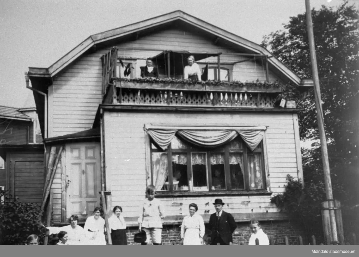 Kvarnbygatan 23, 1920-tal. Gaveln åt väster. På balkongen står fröken Karlsson och hennes mor. På marken från vänster: Astrid Andersson, fyra kvinnor (två av dem hette Jönsson, bägge fröknar), Arne Andersson (tog sig senare namnet Lundälv), Olivia och Axel Andersson, Inga Andersson.