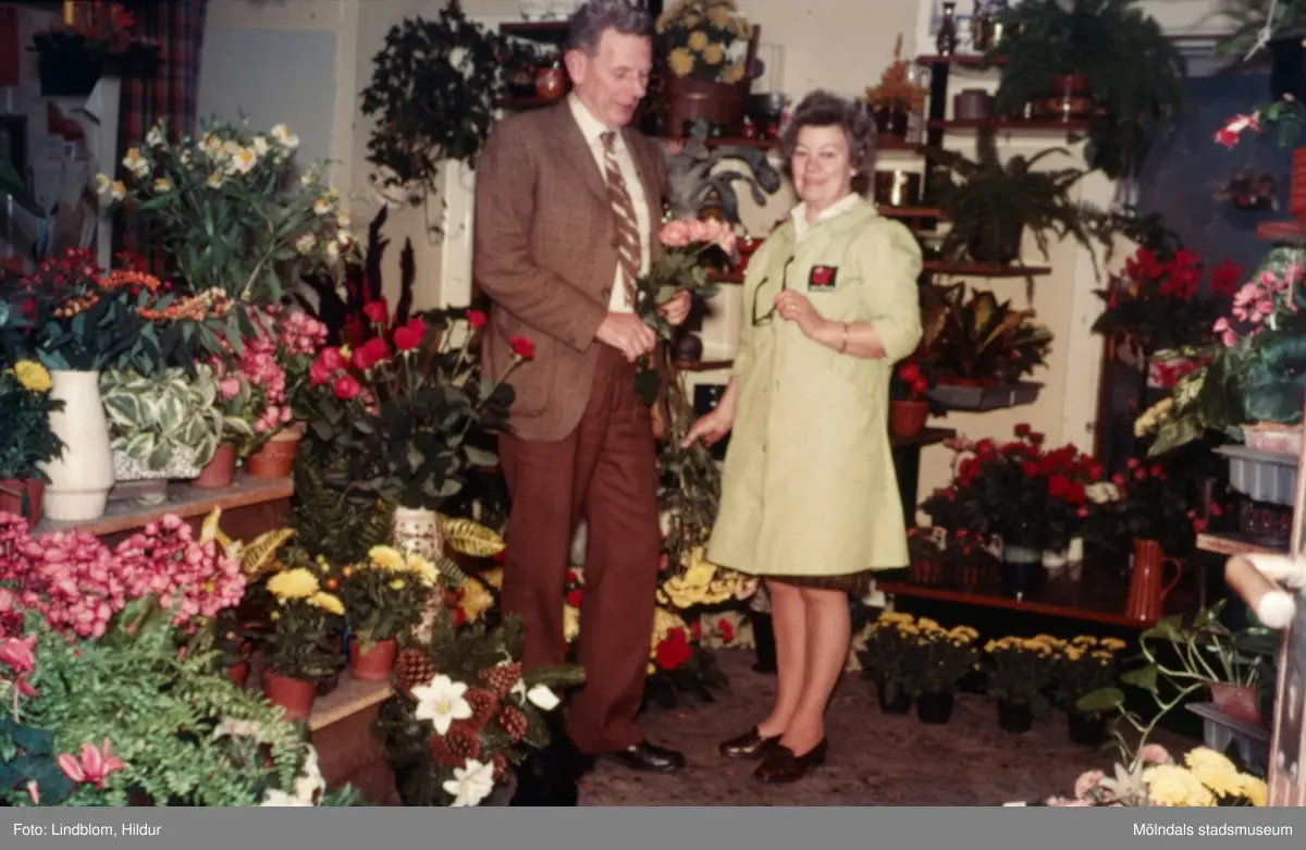 En man och en kvinna fotograferade i blomsteraffären vid Gamla Torget i Mölndal med adress Kvarnbygatan 45, 1970-tal. Kvinnan hette Kerstin och var ägare av affären. Lokalen används numera av Corpus Pizzeria.