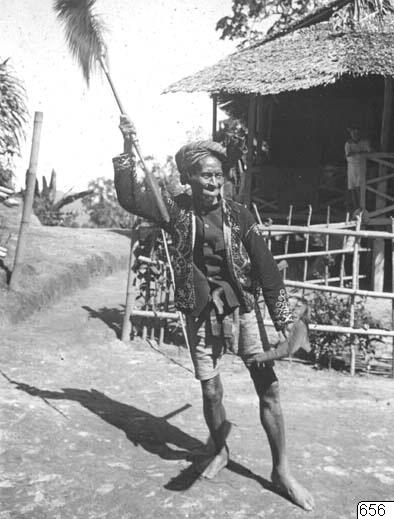 Solo krigsdans i Lojnang, demonstrerad i dec. 1919 av Tomai Lagougga för Walter Kaudern. Se uppgifterna till b. 656 och W. Kaudern: Ethnographical Studies in Celebes IV, Gbg 1929, fig. 114 m. text pp. 444 sqq. Mannen målades i olja av Kaudern. Jfr. avfoto av oljemålningen, bildark 11196.