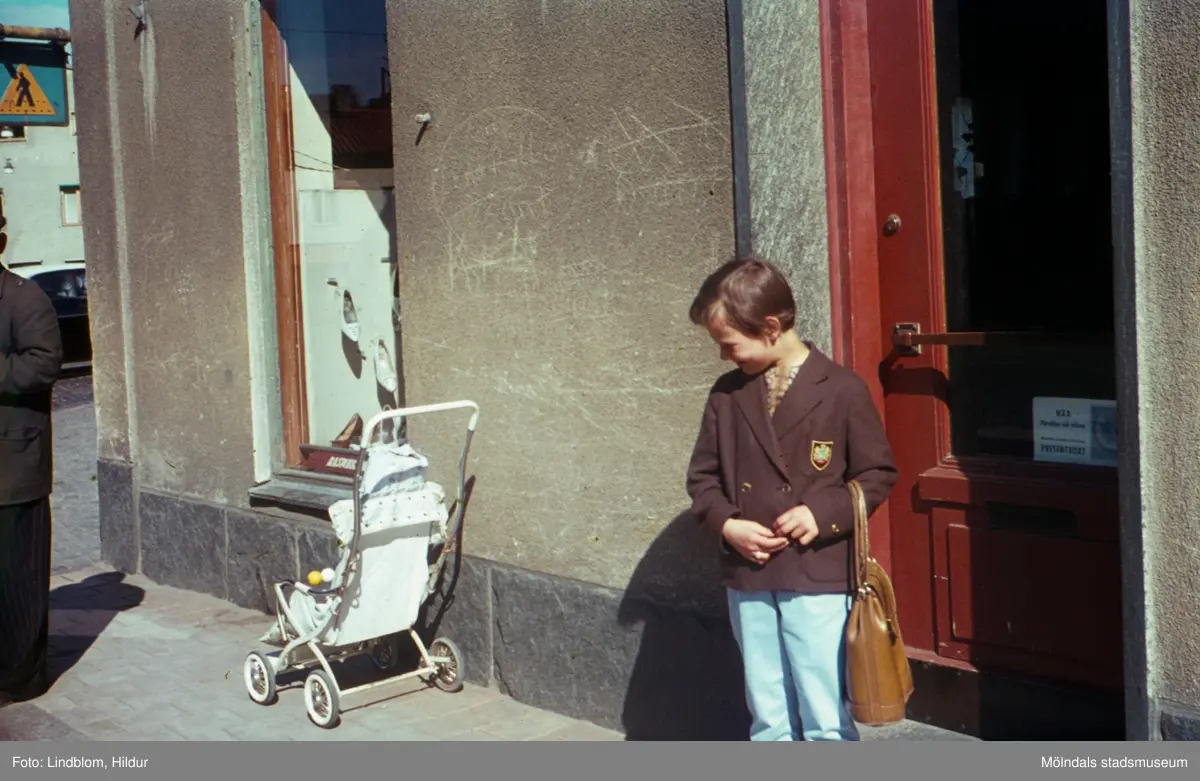 Lisbeth Sjöberg, dotter till Märta Sjöberg, fotograferad på trottoaren utanför Rasmussons skoaffär med adress Kvarnbygatan 4 vid Gamla Torget i Mölndal, ca 1961-1962. På trottoaren står även en sulky.